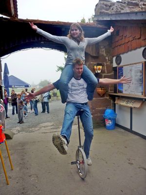 Die Fahrt zur Trendelburg war wie erwartet, nicht sehr weit. Den ersten Anstieg mussten Alle schieben. Dann ging's den Rest der Strecke radelnd weiter. In der Burg angekommen, stapelten wir die Einräder auf einen Haufen und schauten uns um. Viel Zeit hatten wir nicht. Also traten wir bald den Rückweg an.